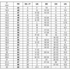 Exemple : vous avez une bague avec un diamètre interne de 16 mm, votre taille de doigt en France est de 51.